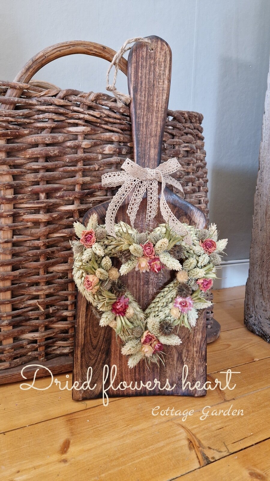Hjärta av torkade blommor på träbricka med krok för upphängning