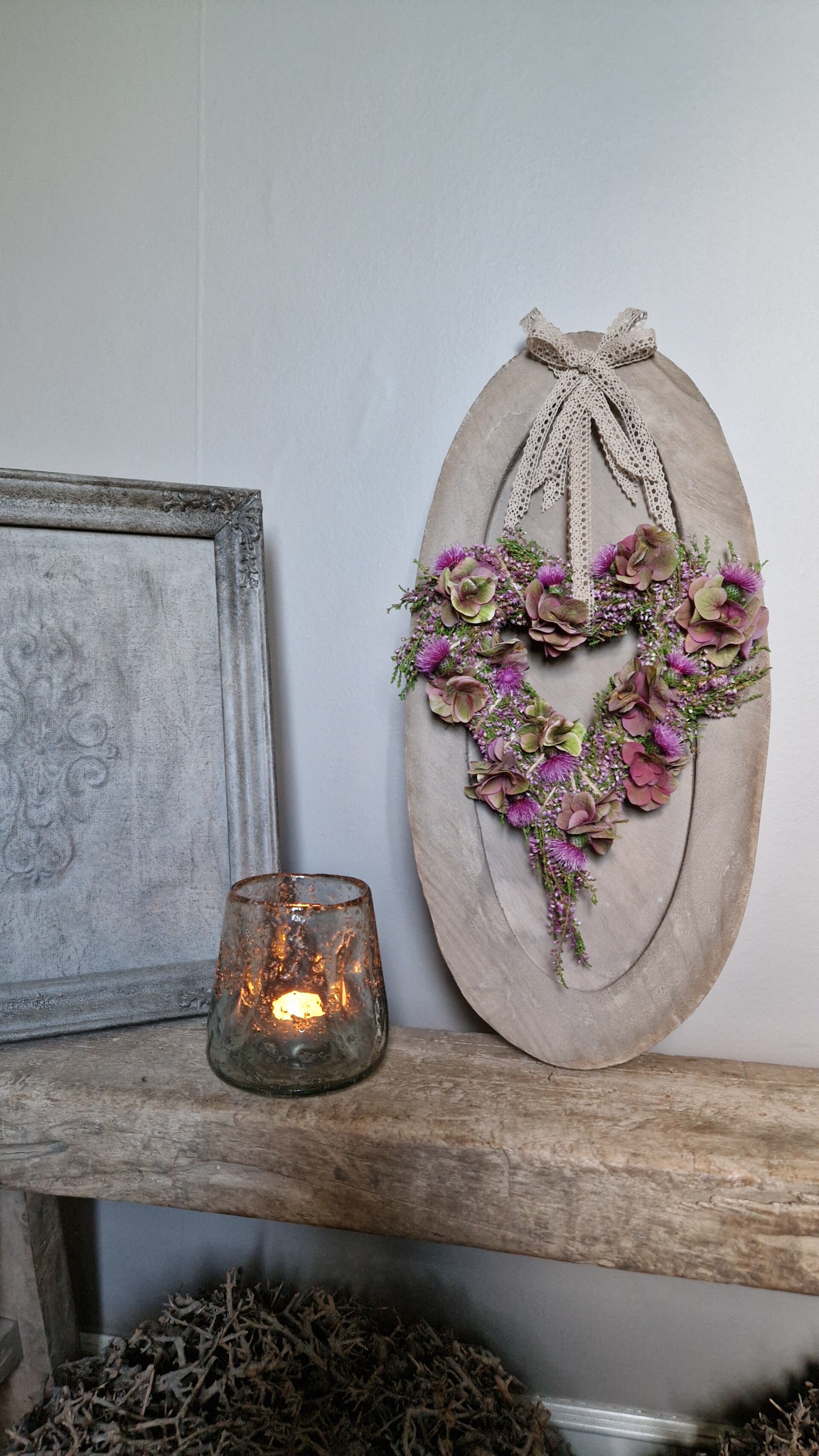Hjärta av torkade blommor på träbricka med krok för upphängning