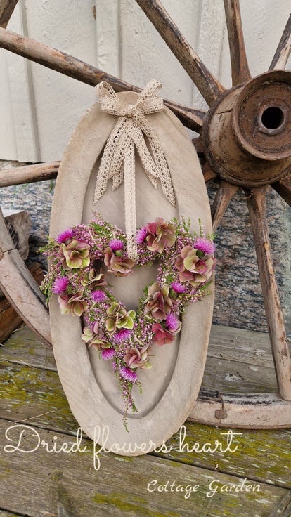 Hjärta av torkade blommor på träbricka med krok för upphängning